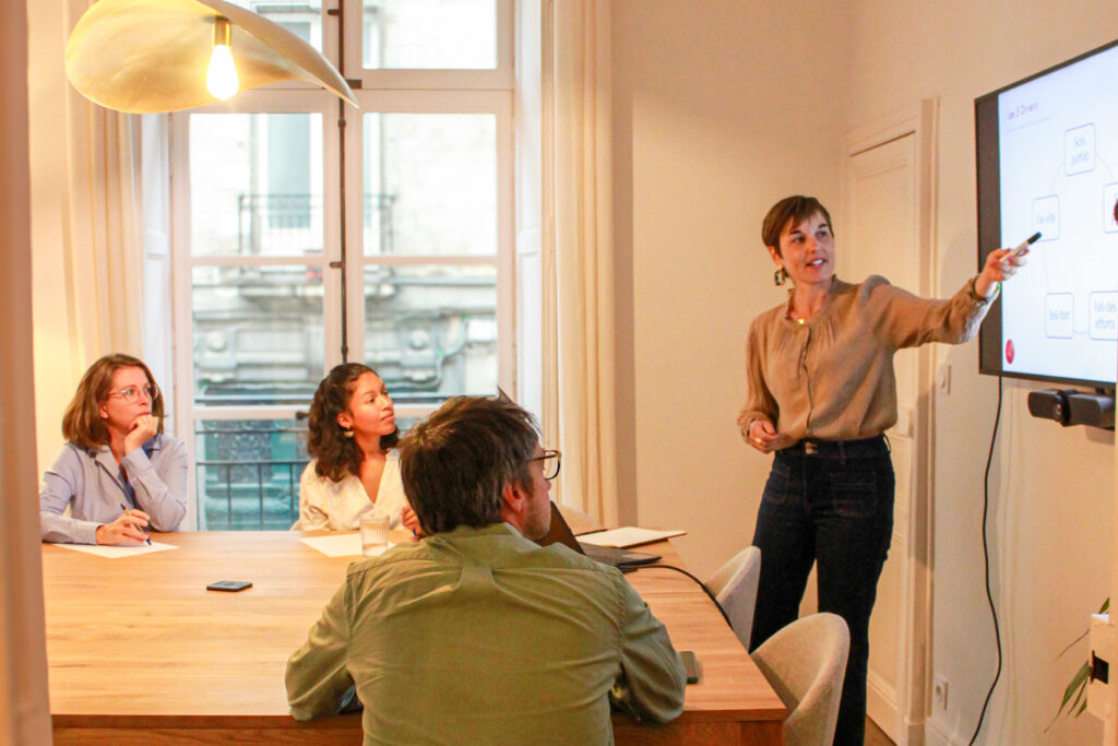 Après 10 ans passés à des rôles de Responsable RH et Manager en entreprise, j’ai senti que je n’étais plus « tout à fait » au bon endroit grâce au déclic de la maternité en 2021. J’ai pris conscience que je n’étais pas à la bonne place et que j’avais besoin d’un véritable changement de trajectoire vers la transmission et l’accompagnement.